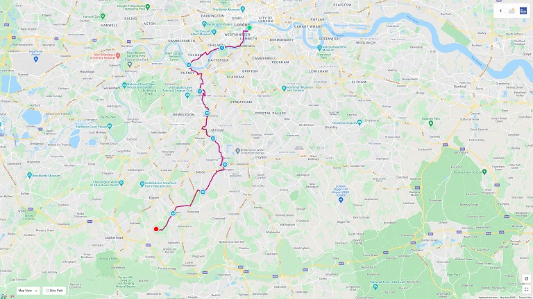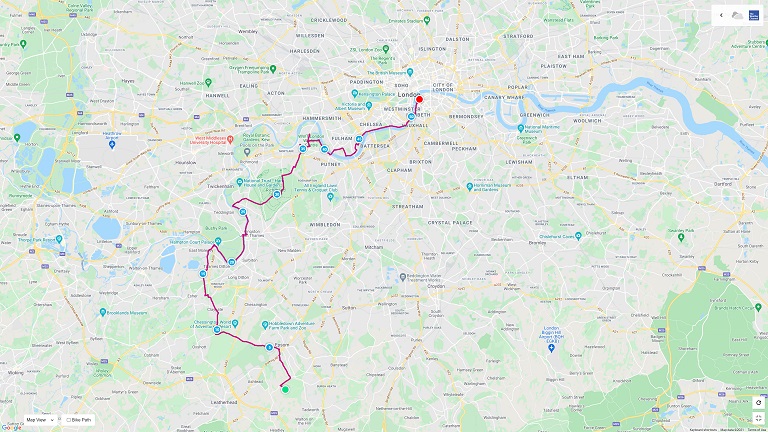 Le mois d’août 2021, mon copain qui s’appelle George, et moi, on a décidé de faire une balade à vélo vers le centre de Londres. George habite à Epson, une jolie ville qui se trouve à 40 kms au sud du centre. En Angleterre il y a un réseau de pistes cyclables. La piste le numéro 4 (NCR-4) traverse Angleterre de Bristol à Londres et entre la capitale à Hampton Court. Le plan : on commence chez George, et on va au pont de Hampton Court et traverser la Tamise à 30 kms à l’ouest du centre de la capitale. On part vers 9h30.